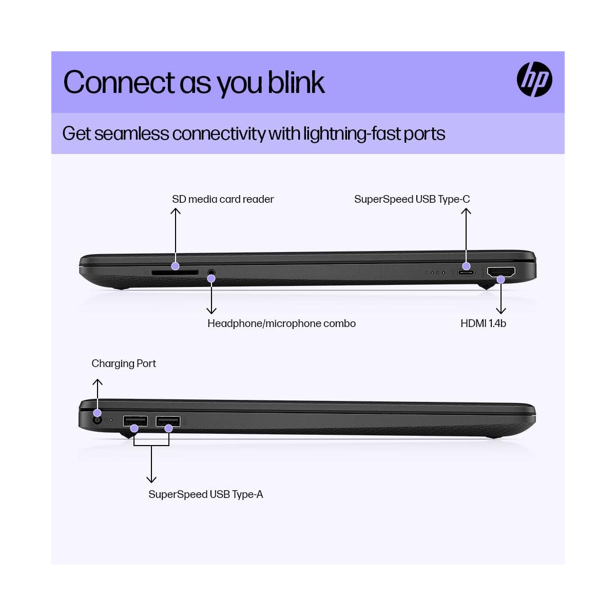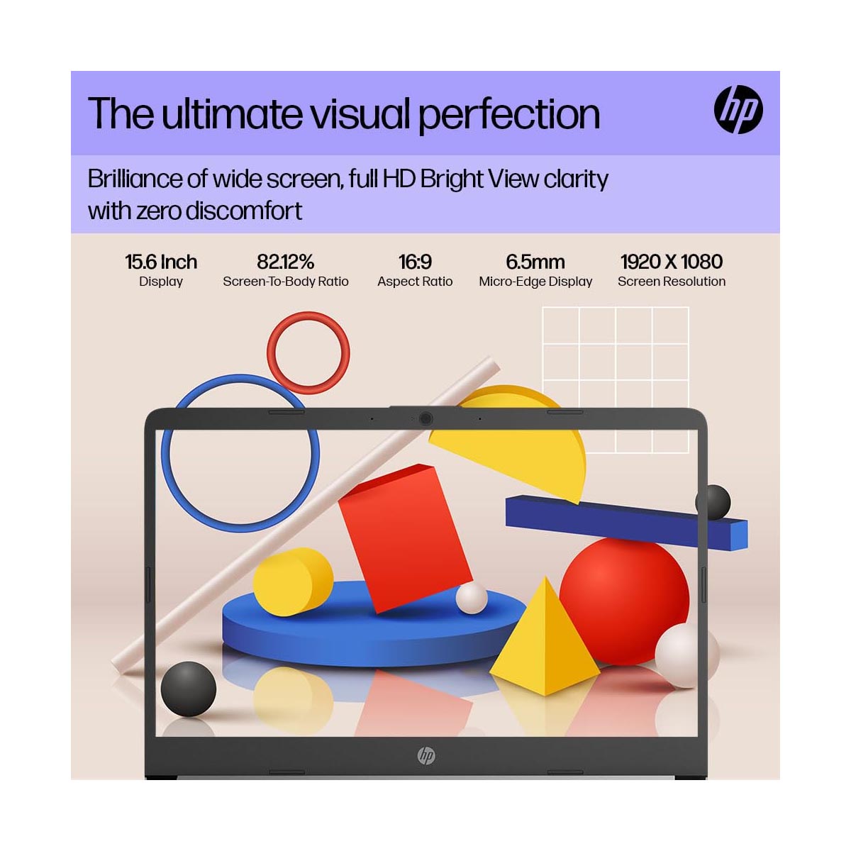 - Display: 39.6 cm (15.6″) diagonal, HD, micro-edge, BrightView, Brightness: 250 nits, 141 ppi, Color Gamut: 45%NTSC, screen Resolution: 1920 x 1080