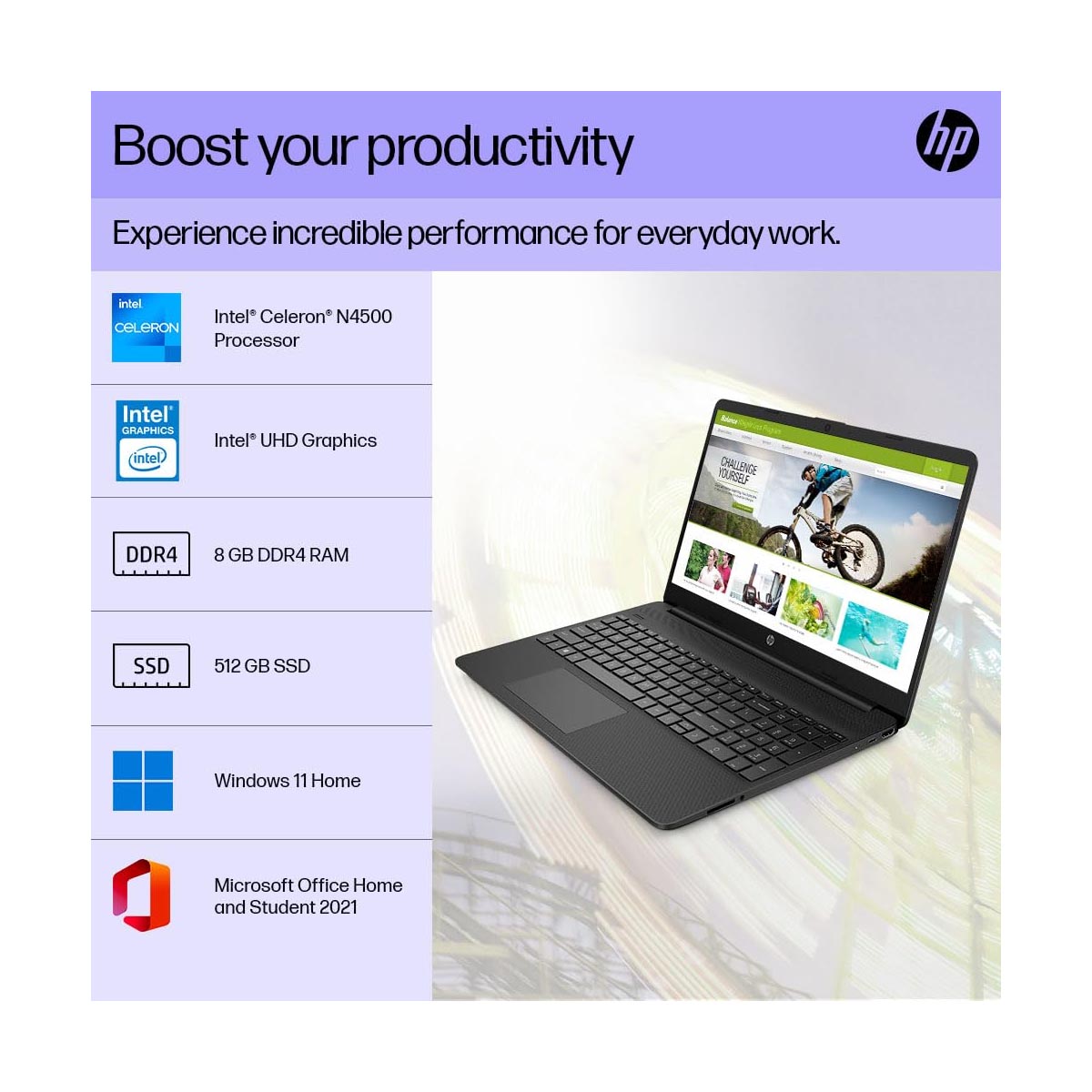 HP 15s- fq3066TU Celeron Dual Core N4500 – (8 GB/512 GB SSD/Windows 11 Home) Thin and Light Laptop (15.6 inch, Jet Black, 1.69 Kg, With MS Office)