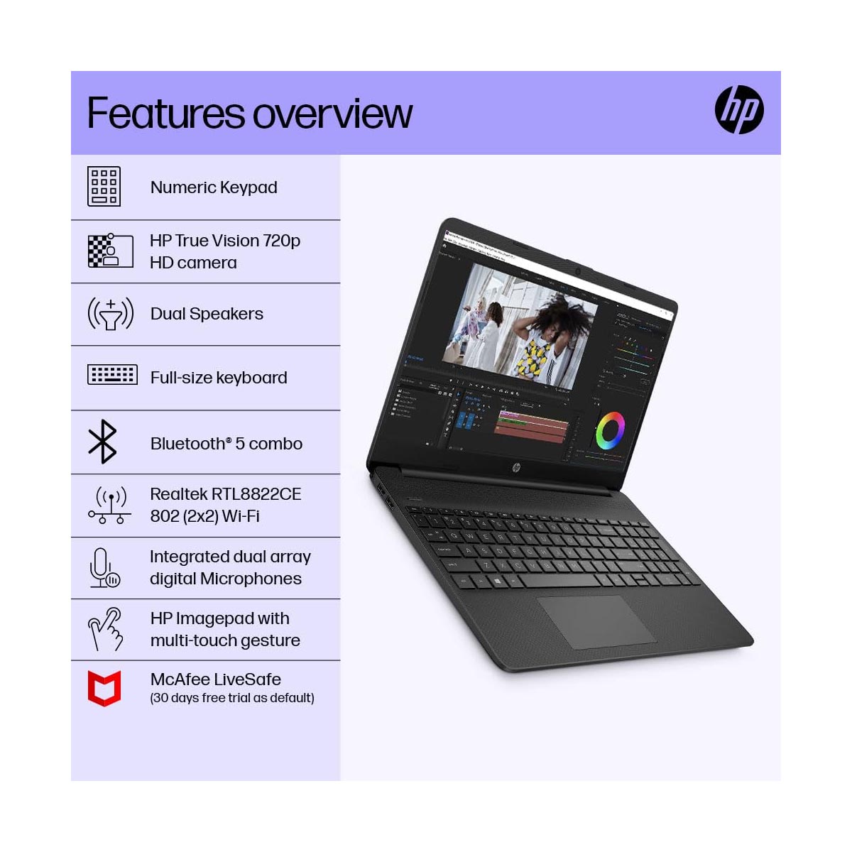- Other Features: Camera: HP True Vision 720p HD camera with temporal noise reduction and integrated dual array digital microphones| Keyboard : Full-size, Jet Black keyboard with numeric keypad; HP Imagepad with multi-touch gesture support|Battery: 3-cell, 41 Wh Li-ion; Up to 7 hours and 30 minutes |Audio: Dual speakers