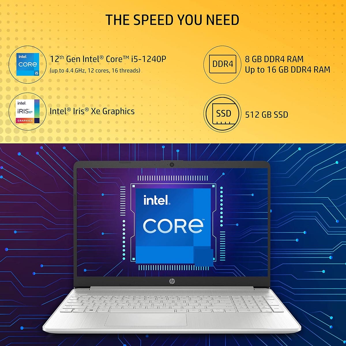 - Do Check Partner offer section for Exciting offers from HP;Processor:Intel Core i5-1240P (up to 4.4 GHz with Intel Turbo Boost Technology(2g),12 MB L3 cache, 12 cores, 16 threads)| Memory & Storage: 8 GB DDR4-3200 MHz RAM (2 x 4 GB), Upto 16 GB DDR4-3200 MHz RAM (2 x 8 GB)| Storage: 512 GB PCIe NVMe M.2 SSD