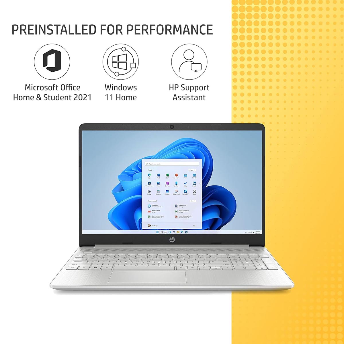 - Display & Graphics: 39.6 cm (15.6″) diagonal, FHD, micro-edge,anti-glare, UWVA, 250 nits, 141 ppi | Graphics: Intel Iris Xe Graphics;Operating System & Pre-installed Software: Pre-loaded Windows 11 Home 64 Single Language| Microsoft Office Home & Student 2021|McAfee LiveSafe (30 days free trial as default)| Pre-installed Alexa built-in- Your life simplified with Alexa. Just ask Alexa to check your calendar, create to-do lists, shopping lists, play music, set reminders, get latest news and control smart home.