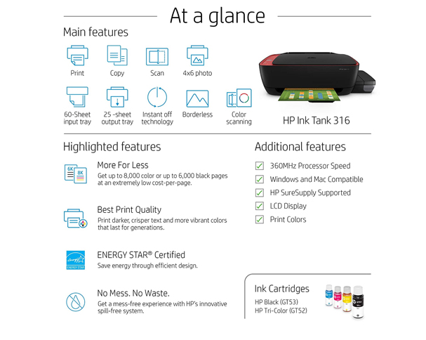 | Mounting Hardware | HP Ink Tank 316, HP GT51XXL Black Ink bottle, HP GT52 Magenta Ink bottle, HP GT52 Yellow ink bottle |
