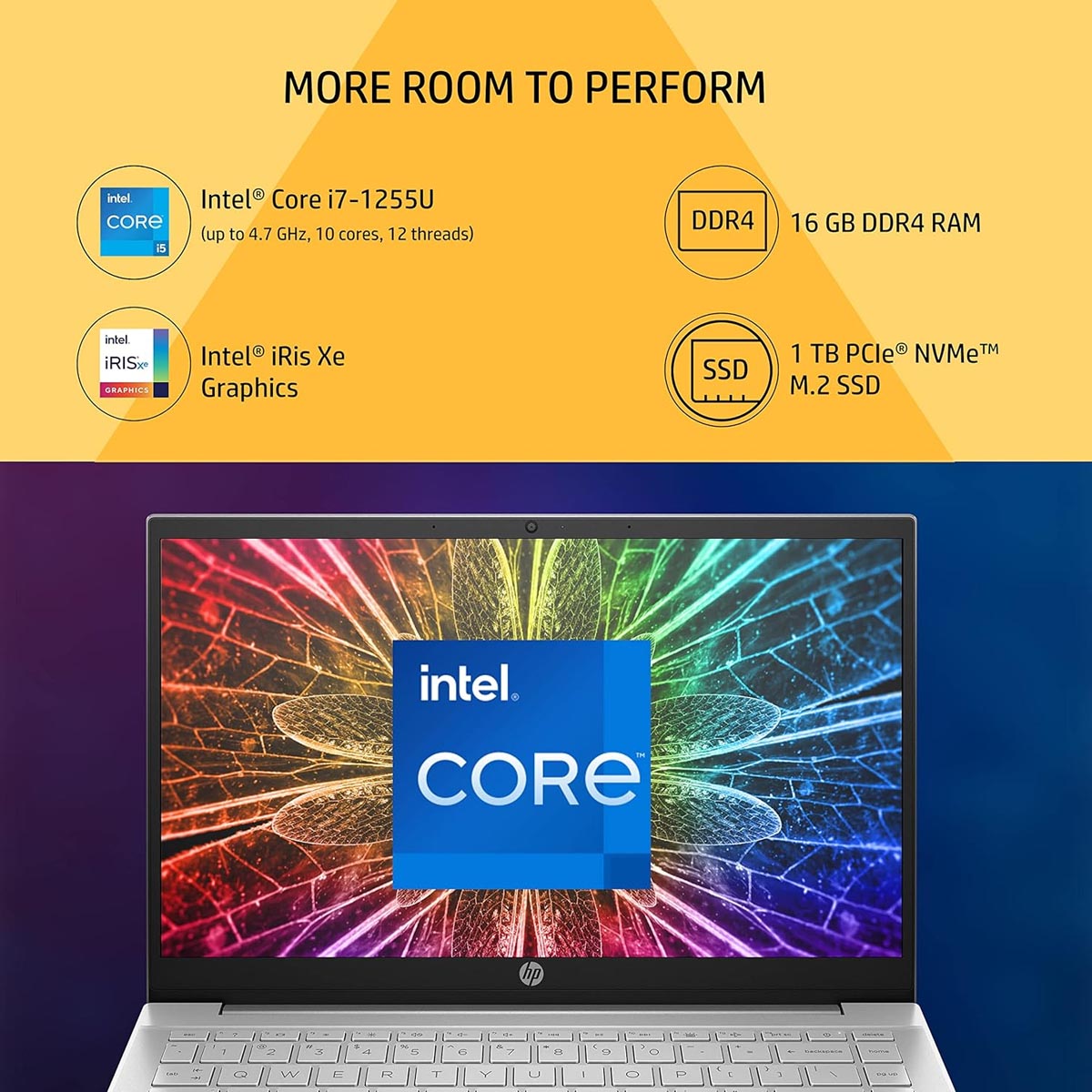 - Do Check Partner offer section for Exciting offers from HP;Processor:Intel Core i7-1255U (up to 4.7 GHz with Intel Turbo Boost Technology(2g),12 MB L3 cache, 10 cores, 12 threads)| Memory & Storage: 16 GB DDR4-3200 SDRAM (2 x 8 GB)| Storage: 1 TB PCIe NVMe M.2 SSD